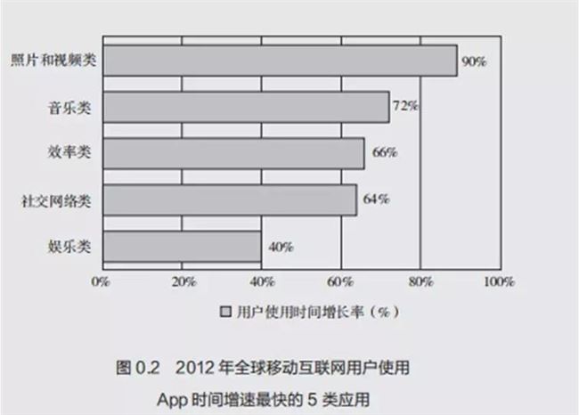 我一直對視頻非常感興趣,也投資了很多相關的企業,比如早期的 PPS(網絡電視軟件)、迅雷,在 2004 年我還投資了一個在手機上做直播的公司,團隊的技術能力很強,但最后卻沒有成功。經歷過那個階段,你會發現當時的應用程序可以做得很好,但大環境還沒有成熟。到了 2011 年,我們就覺察到 Everything is ready(一切都準備好了)。當時 Facebook 與微博發展得已經不錯了,而信息流也成了一個相對主流的形態,與手機緊密結合,能夠實現非常好的傳播效果。(2012 年全球移動互聯網用戶使用 App 時間增速最快的 5 類應用見圖 0.2。)