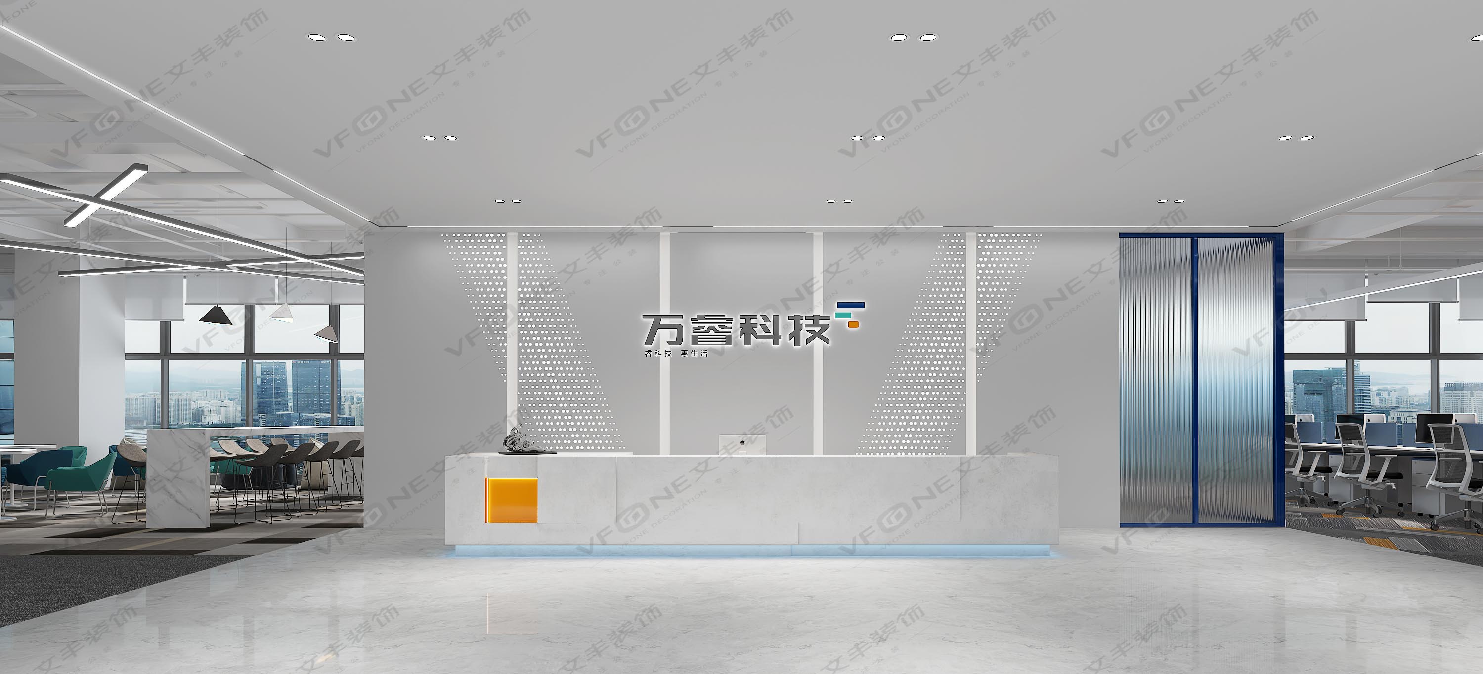 以萬(wàn)睿企業(yè)文化從前廳到辦公區(qū)設(shè)計(jì)以高端科技為主,大前廳以內(nèi)嵌氛圍線條燈展示,以槍灰色瓷磚和大理石瓷磚融合,前廳主打色以端莊、成熟為主!右側(cè)砌墻隔斷方便接待客戶洽談為主要作用,在了解萬(wàn)睿企業(yè)文化從中提取出 元素作為整個(gè)空間的主要裝修材料,為了凸顯他的科技企業(yè)的身份,文豐用不同的色彩在不同的功能區(qū)表達(dá)不一樣視覺(jué)感,讓前廳和辦公區(qū)擁有更多不同的主題設(shè)計(jì)。