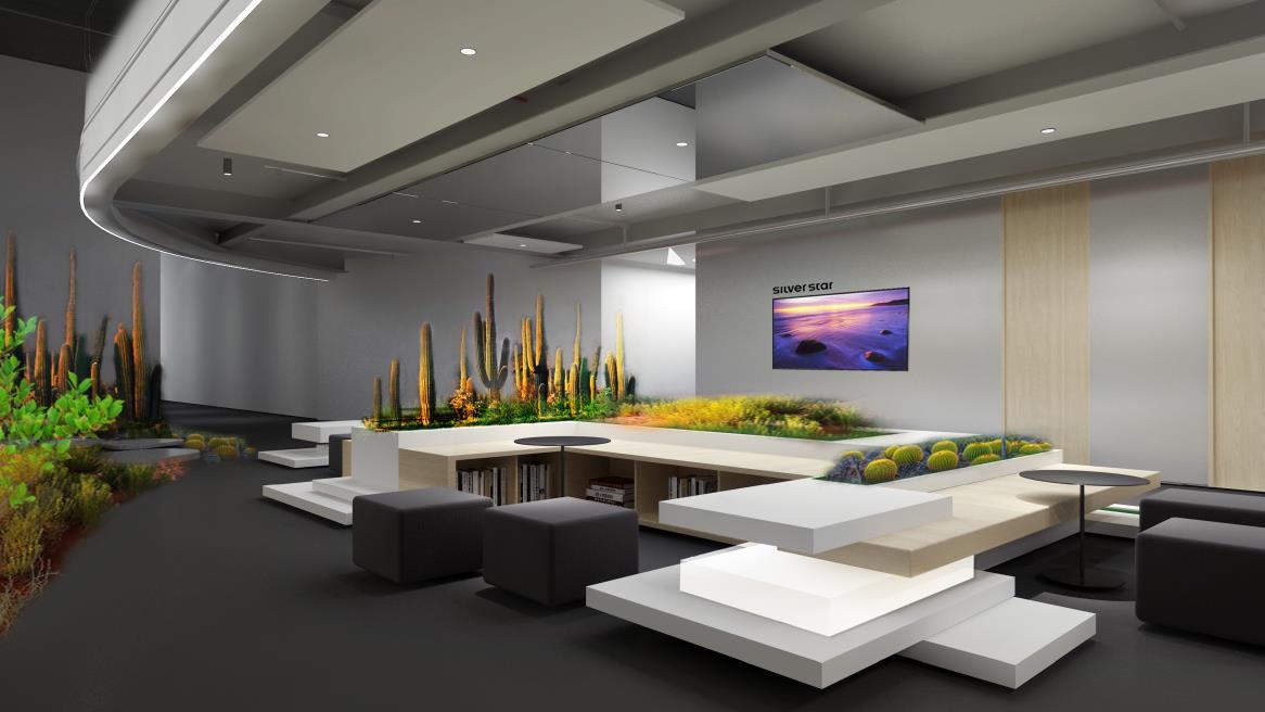 前臺(tái)設(shè)計(jì) 整體色調(diào)是銀白色,進(jìn)門處定制LOGO投影,兩側(cè)用流動(dòng)燈光效果,結(jié)合空間中的鏡面,使整個(gè)空間營(yíng)造出一種未來(lái)的科技感!天花板的挑高設(shè)計(jì),讓整個(gè)空間看起來(lái)更加明朗開(kāi)闊。
