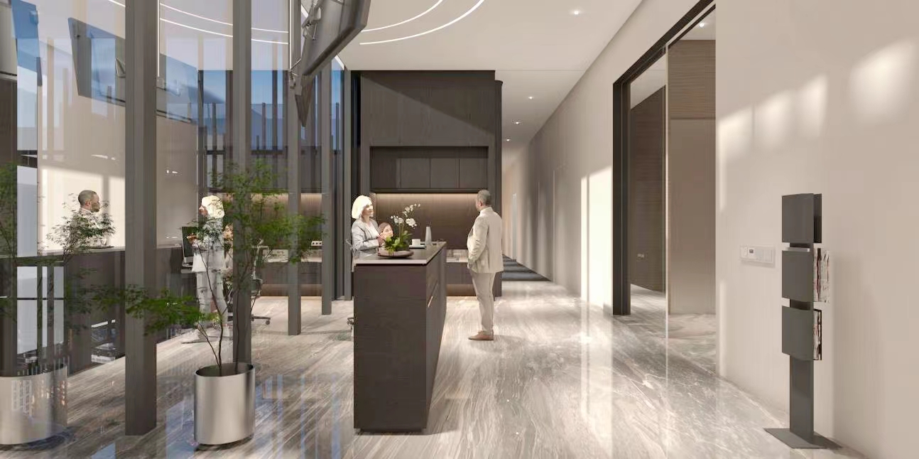前臺以現代簡約和鏡像的設計原理,沒有過多的裝飾,創建了開敞大氣的迎賓前臺大廳,更能彰顯出金融公司高端、簡潔、大氣的特質。