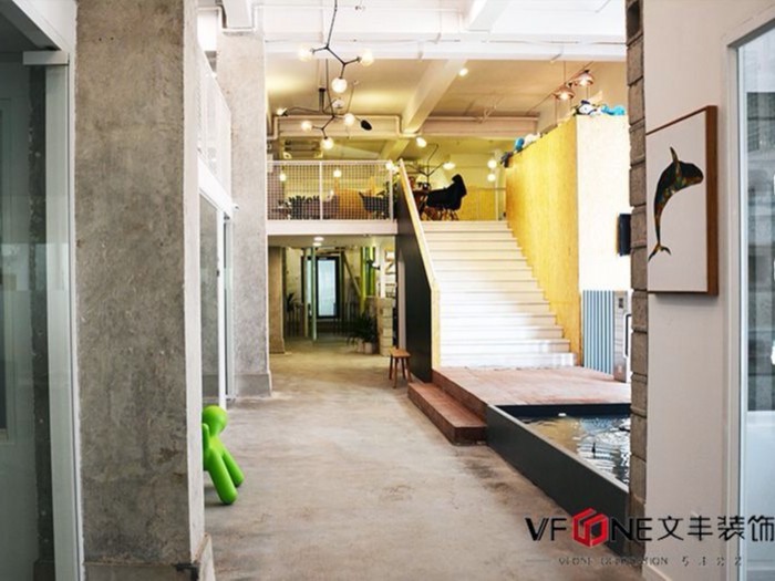 一樓與二樓以白色階梯進(jìn)行連接,在樓梯的左邊的墻面上趴著大小顏色不一的海豚,讓整個(gè)空間更有童趣。一樓設(shè)置了一個(gè)水池,不僅可以讓整個(gè)空間有了風(fēng)水,更有一個(gè)玩耍的地方。天花上的燈飾在方向各異,為這個(gè)空間增加藝術(shù)感和樂趣