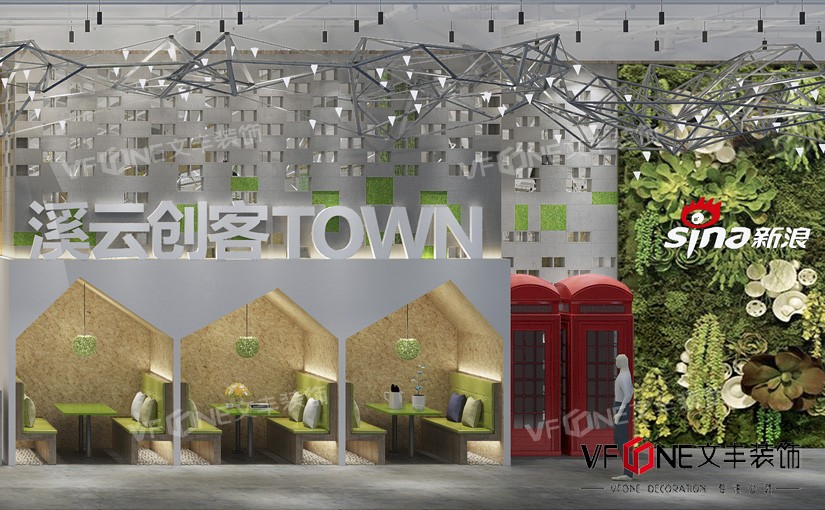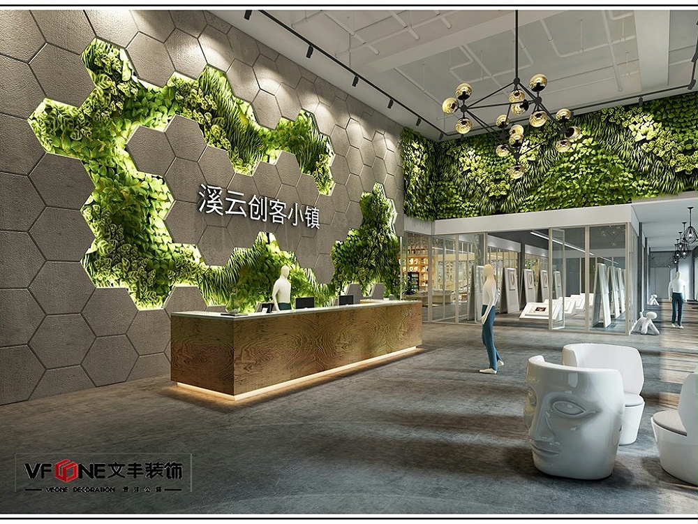 為了貼近當(dāng)?shù)氐沫h(huán)境,設(shè)計(jì)師在辦公區(qū)中安排了大量植物,前臺(tái)溪云小鎮(zhèn)包圍在植物組成云朵中,用多個(gè)六變形組成背景墻,塑造科技感,將“溪云小鎮(zhèn)”的含義體現(xiàn)出來(lái)。