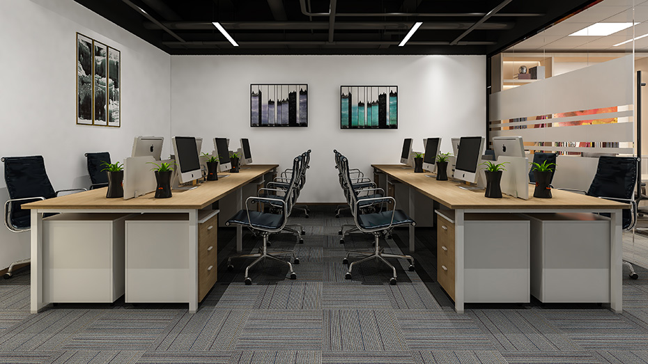 開放辦公區(qū)設(shè)計充分考慮功能空間的人員流動性、便捷性與舒適性,并適當(dāng)?shù)牧舭卓臻g,多樣式綠植、淺灰色條紋地毯、黑色樸素吊頂、白色的柱子和燈帶相互映襯,素雅、簡約、大氣。洽談區(qū)與開放辦公區(qū)的設(shè)計形成呼應(yīng),增加了空間的對比和張力。