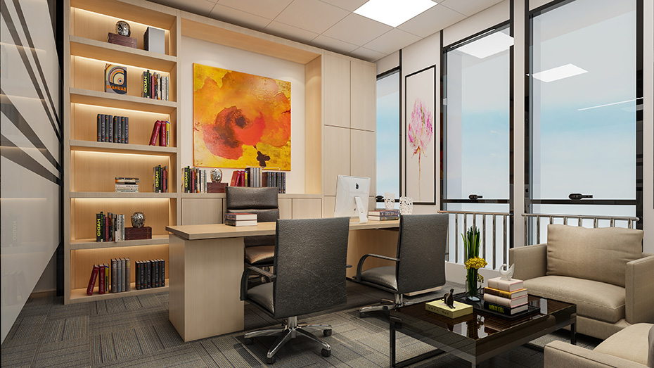 經(jīng)理室與財務(wù)室的設(shè)計合理運用了空間的轉(zhuǎn)角凹位和落地窗來擴(kuò)大視覺范圍,并采用窗邊的綠色裝飾品來緩解、改善辦公空間的沉悶感與壓抑感,突出簡約大氣的特點,體現(xiàn)和諧、時尚的空間氛圍。