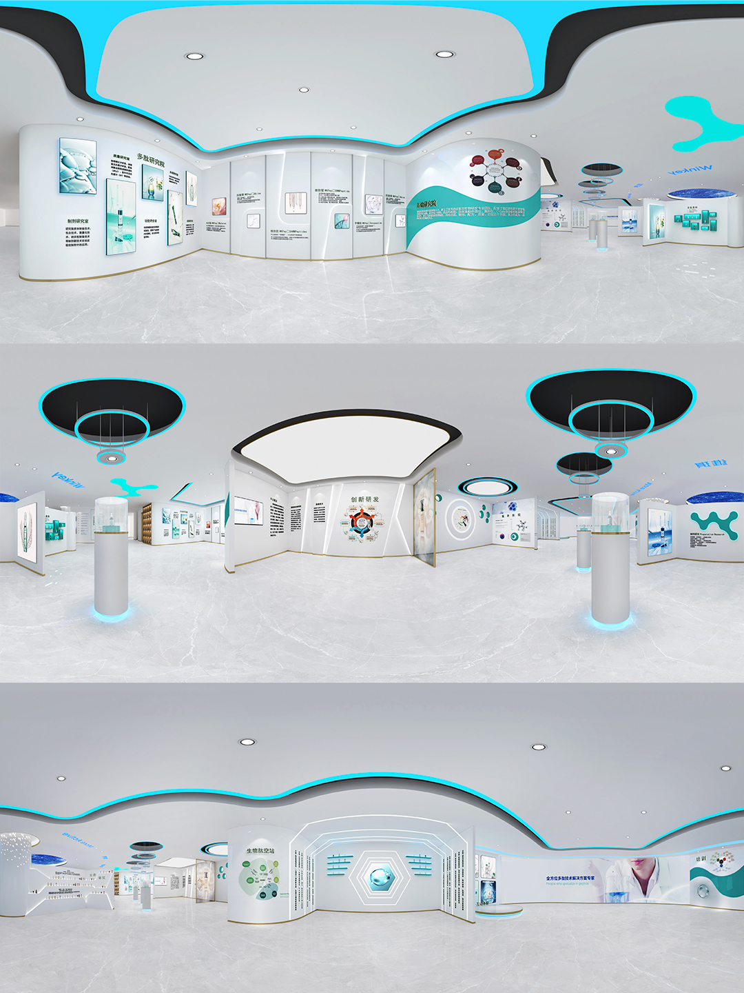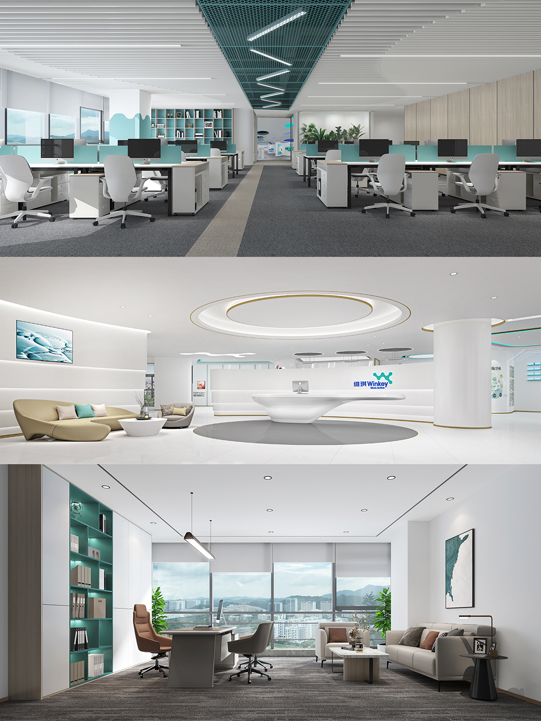 前廳空間 以大面積的白色作為空間的主色調(diào),充分展示了Winkey作為化妝品功效原料研發(fā)、生產(chǎn)和應(yīng)用企業(yè)的潔凈屬性。同時(shí),在立體空間中將線條運(yùn)用在前臺(tái)、背景墻、地磚和天花燈的設(shè)計(jì)當(dāng)中,結(jié)合白色空間的主色調(diào),讓人不由自主地聯(lián)想到絲滑通透的面霜質(zhì)地,完全符合企業(yè)調(diào)性。